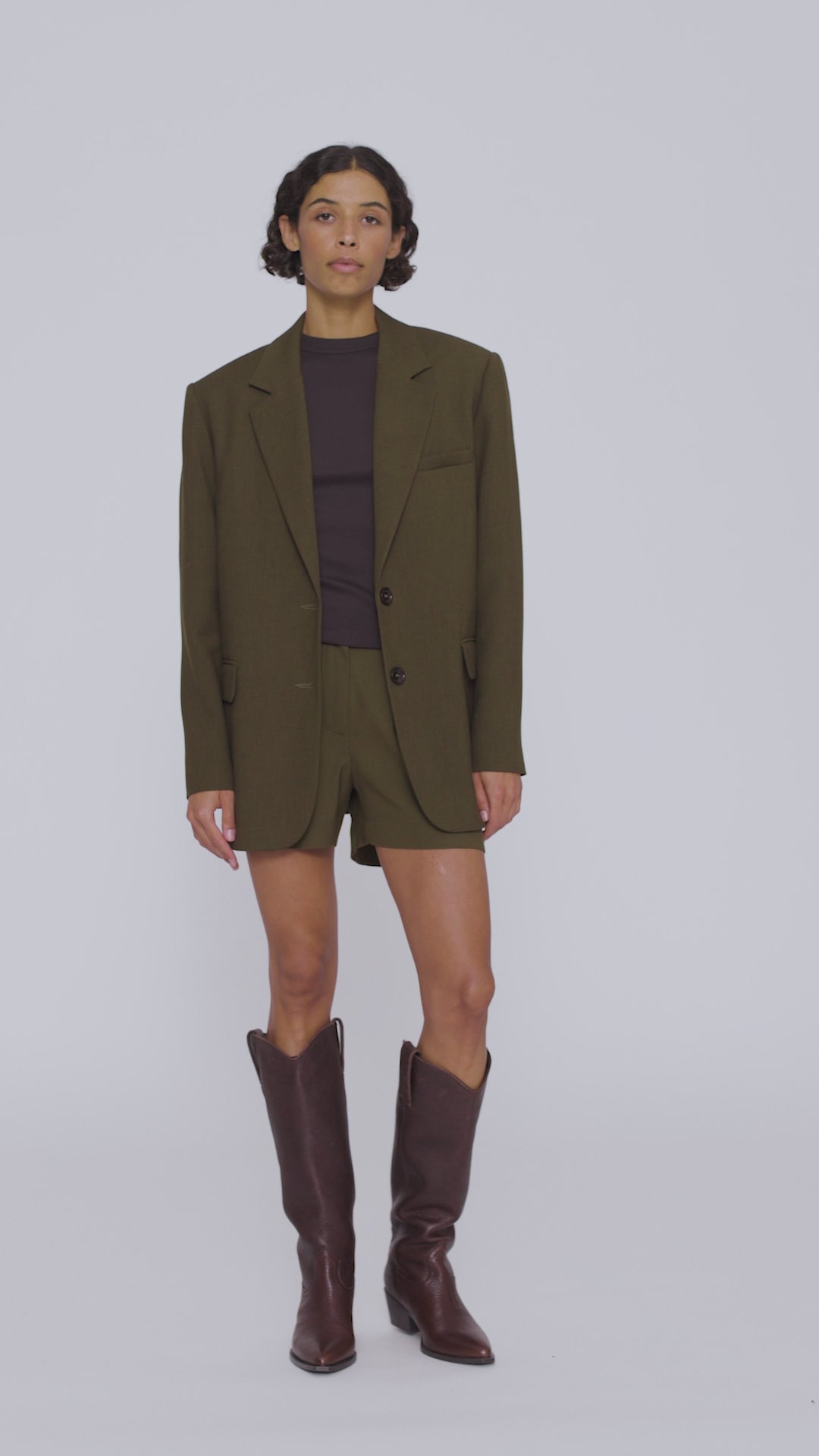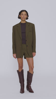 The Scott blazer features a slightly oversized cut, made from a premium green wool and viscose blend fabric. Structured shoulders give it a distinctive look, while the lightweight construction ensures it drapes beautifully on the silhouette. Classic lapels, a two-button closure, and three pockets emphasize its timeless design. The back slit provides freedom of movement and adds a sense of lightness. For a complete look, pair it with the Lucky shorts.