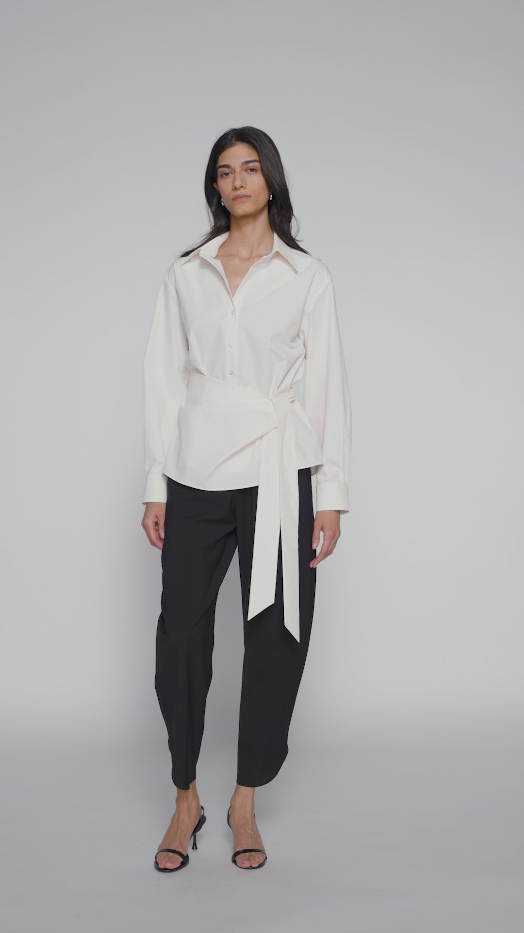 The Julien shirt features clean, elongated lines and a subtly accentuated waist. A button-front placket and distinctive waist panel allow for individualized ties and body shaping—from a relaxed fit to a more defined silhouette.