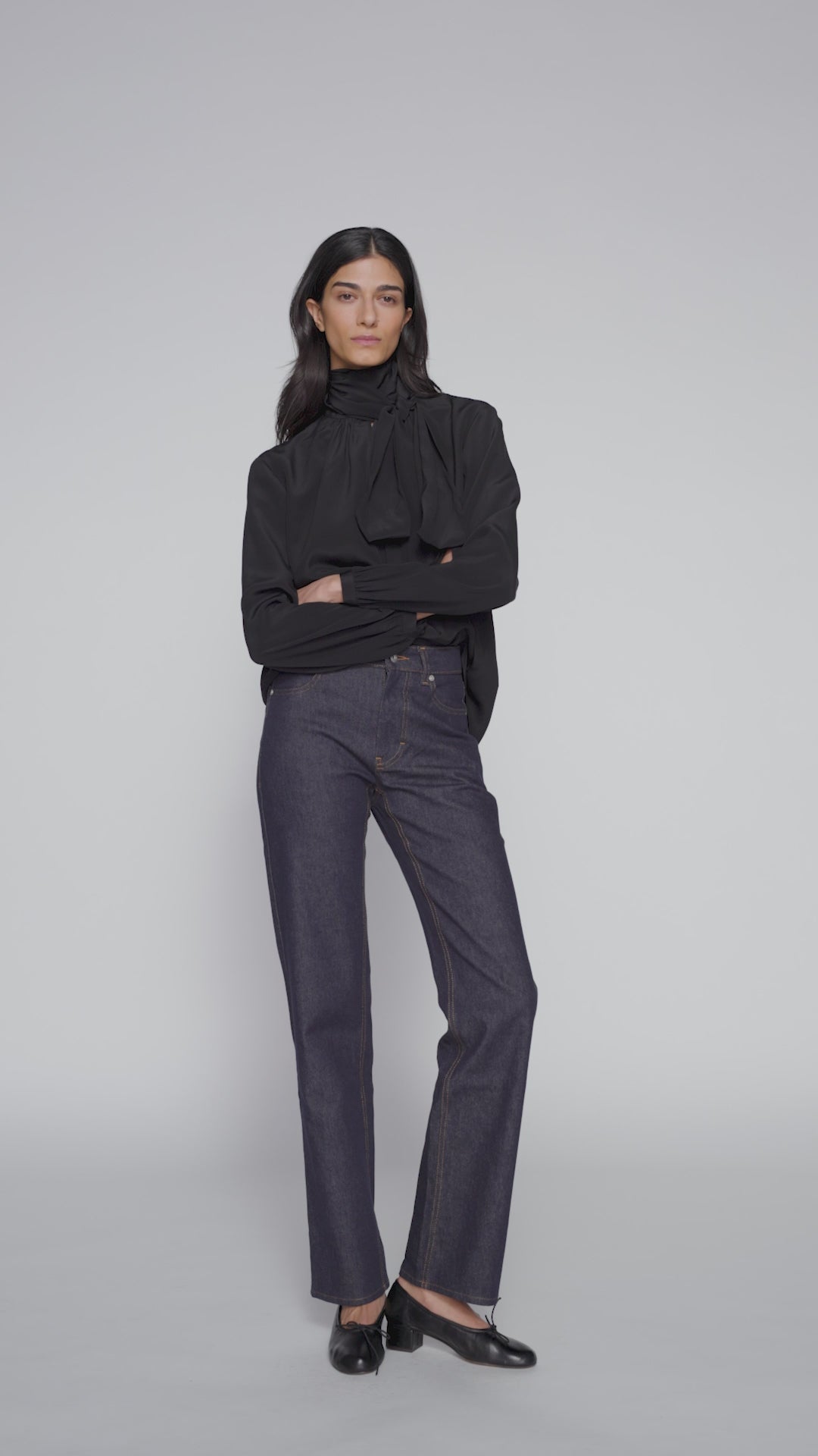 The Kendra blouse is crafted from high-quality silk with a smooth, soft feel. The slightly oversized cut ensures ease of wear and drapes naturally on the body. It's finished with a long sash at the neckline, which can be tied in various ways. The sleeves, finished with narrow cuffs, emphasize the clean lines of the design. Minimalist and meticulously crafted, it works well with both casual and more formal outfits.