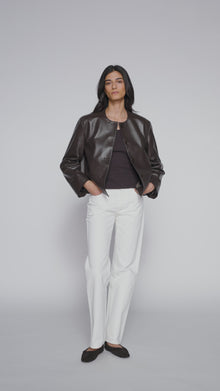 The Marcus jacket is crafted from high-quality genuine leather with a smooth finish. It features a simple, slightly cropped silhouette, a round neckline, and a button-front closure.
