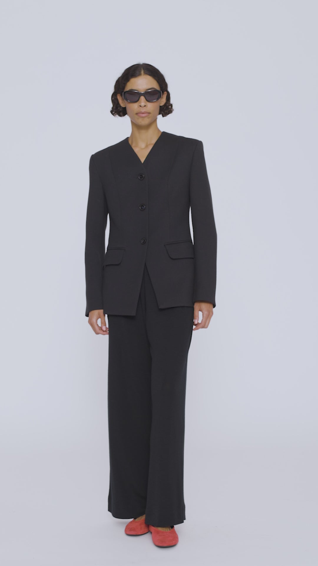 The GARRET blazer is a tailored piece made from virgin wool. It features structured shoulders, vertical seams that define the silhouette, and a three-button front closure. A classic design that works well both on its own and as part of a set.