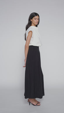 The Mathilda skirt is crafted from a flowing blend of cupro and viscose. The shape is created by sewn-in gussets, which add volume and rhythm to the hemline. The design features a smooth yoke waistband and a concealed zipper closure. The silhouette is defined by its construction and proportions.