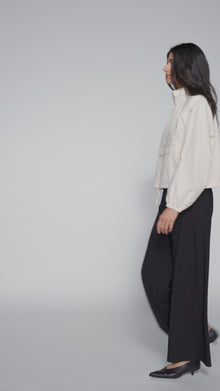 The Ortiz is a lightweight, casually cut cotton jacket with a zipper closure. Front pockets add functionality, and an adjustable waist allows for a custom fit. The stiffened collar and elastic cuffs give it a distinctive shape, emphasizing its versatile nature.