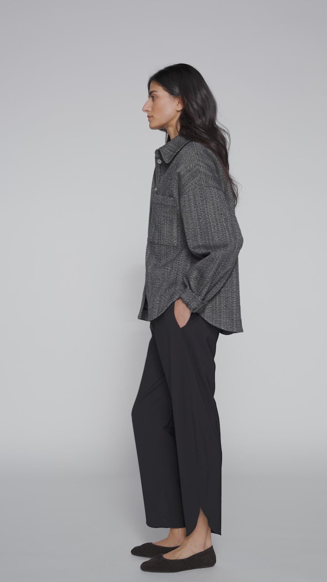 The Sheryl overshirt is made from a wool and cotton blend with a distinct, slightly structured texture. The fabric has a fine, contrasting weave, giving the surface subtle depth and a natural character. It has a relaxed, slightly oversized fit with a classic collar and button closure. The sides are subtly cut, giving the silhouette a light silhouette and allowing for easy movement. The sleeves are finished with cuffs, and the front is balanced by a clean line. It can be worn as a shirt or as a lightweight layer – over a top, sweater, or T-shirt.