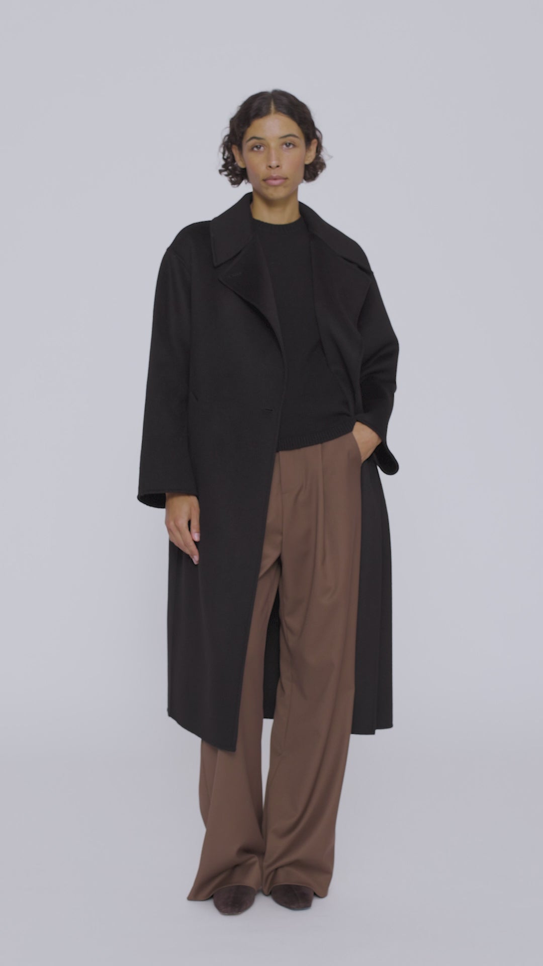 The CARTER long coat features a straight, slightly relaxed silhouette and is made from double-face wool — two layers of fabric are hand-stitched together, eliminating the need for a lining and creating a clean, refined interior finish. The coat remains lightweight yet warm and structurally stable. A wide collar and concealed buttons emphasize its minimalist character. Available in two color options.