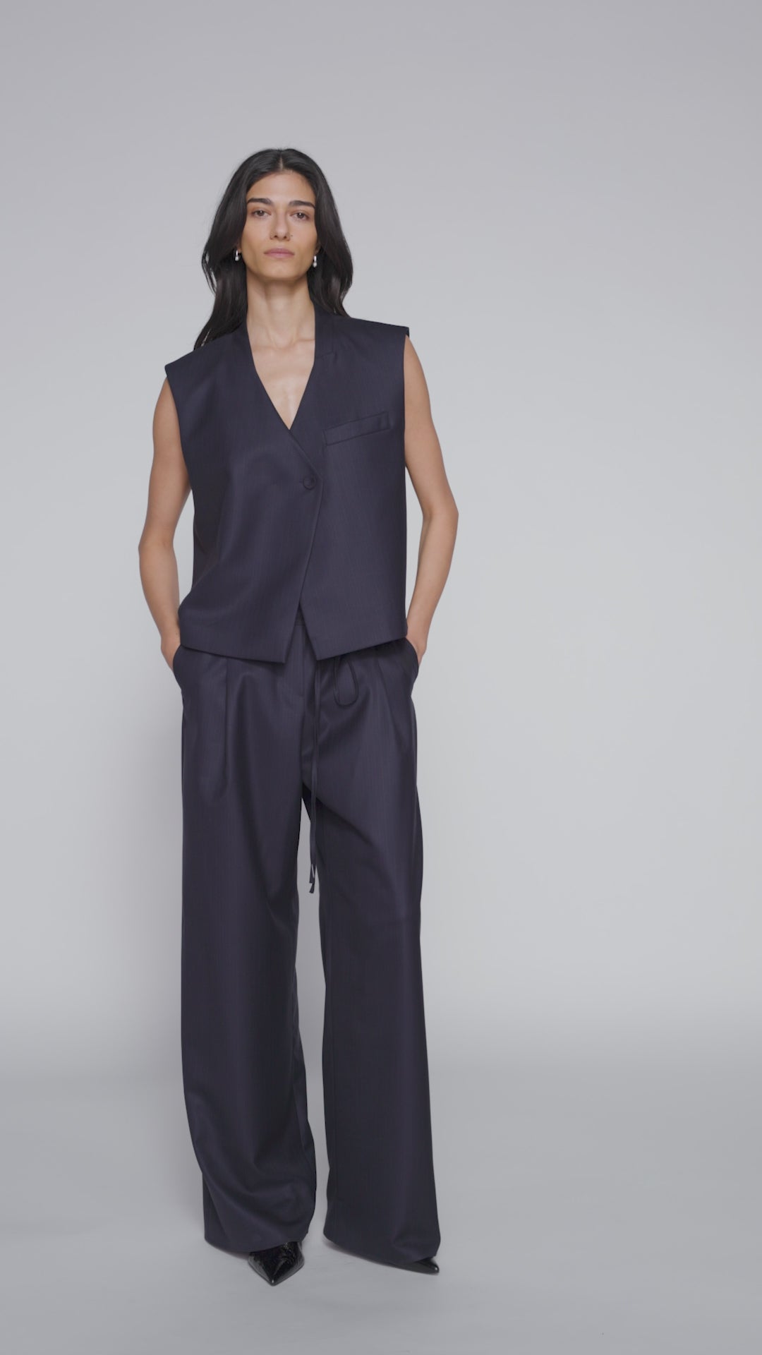 The Shawn vest is crafted from navy blue lambswool with a subtle pinstripe. Its boxy construction and oversized shape give it a casual, balanced look. An inner and outer button closure allows for adjustable wear and accentuates the asymmetrical front. Designed to be paired with Lowen trousers.